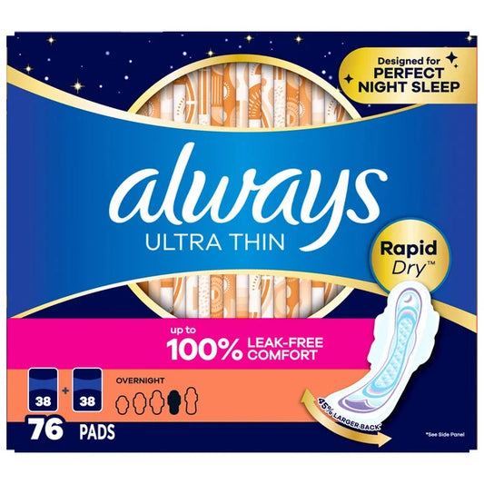 Always Ultra Thin Overnight Pads with Wings, Unscented, Size 4, 76 ct