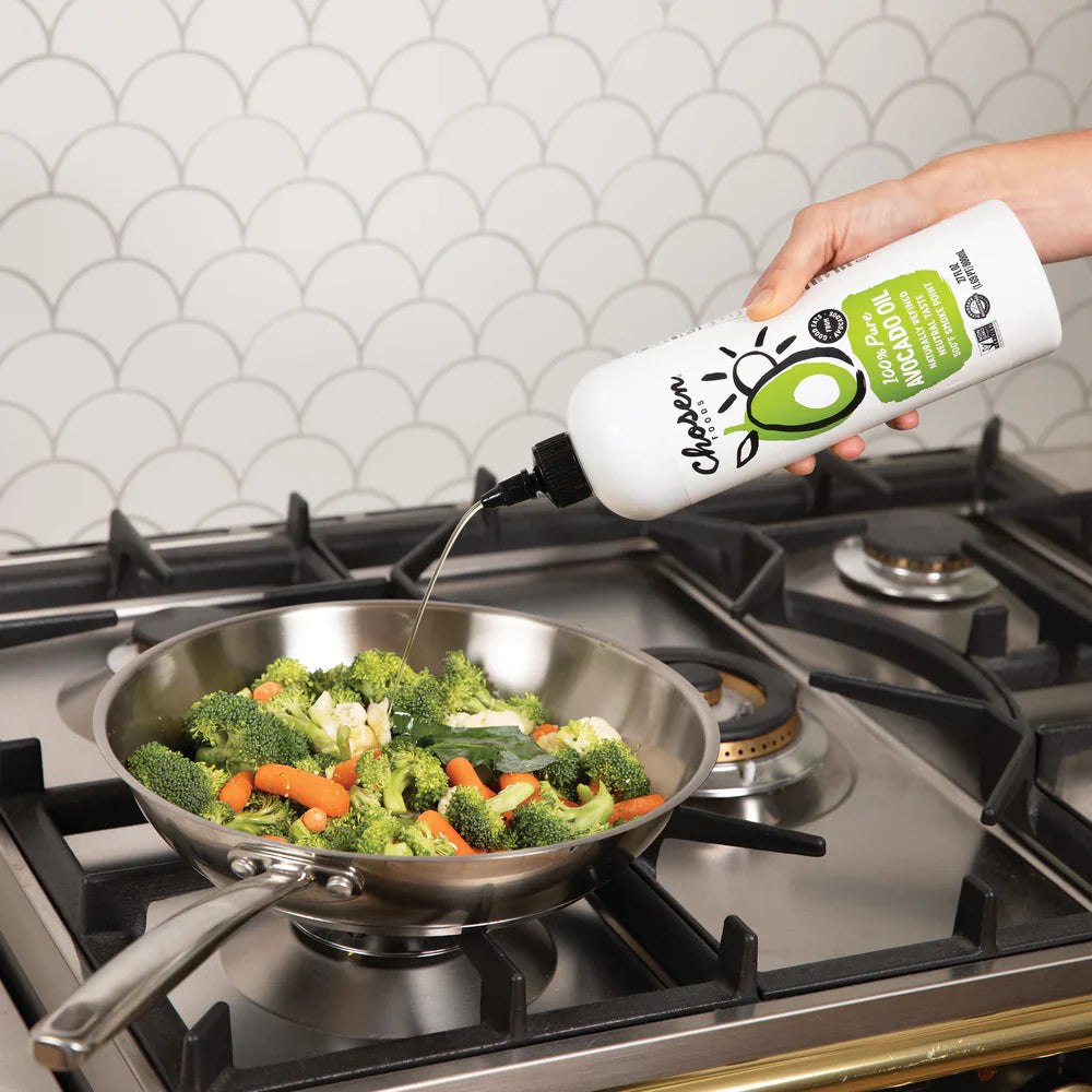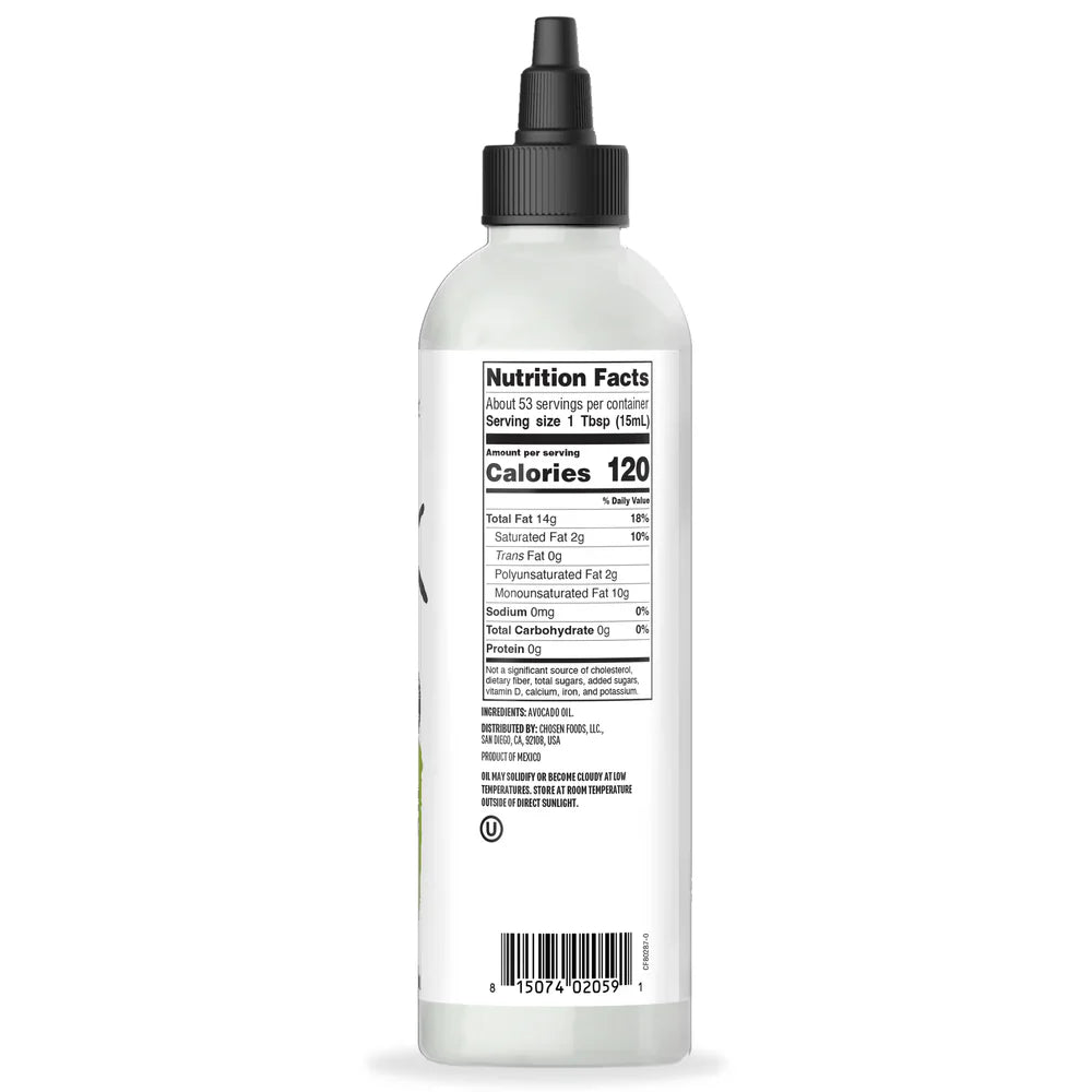 Chosen Foods 100% Pure Avocado Oil Squeeze Bottle, 27 oz, is a versatile and high-quality cooking oil. Made from 100% pure avocados, this oil is naturally refined and provides a mild, buttery flavor that enhances a variety of dishes. It has a high smoke point of 500°F, making it perfect for frying, sautéing, baking, and grilling. Chosen Foods Avocado Oil is non-GMO, gluten-free, and contains no artificial ingredients. Enjoy the health benefits and rich flavor of Chosen Foods 100% Pure Avocado Oil in your favorite recipes.