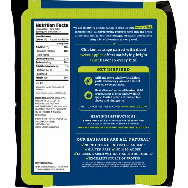 The Aidells Chicken Apple Sausage comes in a 48-ounce package. These sausages are made with all-natural ingredients, including juicy chicken, sweet apples, and a blend of spices. They are fully cooked, gluten-free, and contain no artificial ingredients, nitrites, or nitrates. Perfect for grilling, sautéing, or adding to your favorite recipes, these sausages offer a delicious and convenient option for any meal. Enjoy the unique and flavorful taste of Aidells Chicken Apple Sausage in your culinary creations.