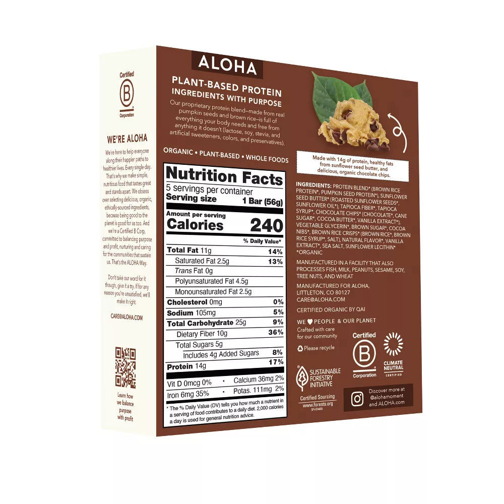 Aloha Chocolate Chip Cookie Dough Nutrition Bars, 9.88 oz, are a delicious and nutritious snack made from organic ingredients. Each bar contains 14 grams of plant-based protein, is gluten-free, soy-free, dairy-free, and free from sugar alcohol sweeteners. Packed with sunflower butter, vegan chocolate chips, and brown rice protein, these bars offer a chewy, cookie dough texture with a generous helping of chocolate chips. Perfect for a healthy treat on-the-go!