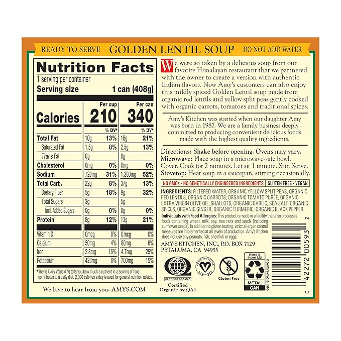 Amy's Organic Golden Lentil Soup is a delicious and nutritious meal option. This 14.4 oz can features a blend of organic red lentils and yellow split peas, cooked with organic carrots, tomatoes, and traditional mild Indian spices. The soup has a creamy texture and is rich in protein from the lentils and peas. It is gluten-free, soy-free, lactose-free, corn-free, tree nut-free, and suitable for vegans. Enjoy this wholesome and hearty soup on its own or poured over rice for an authentic Indian meal.