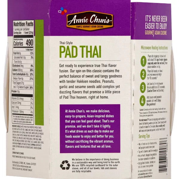 Savor the authentic flavors of Thailand with Annie Chun's Thai-Style Pad Thai Noodle Bowl. This 8.1 oz bowl offers a delicious blend of tender rice noodles, vegetables, and a tangy, savory sauce, capturing the essence of traditional Pad Thai. Perfect for a quick and easy meal, it’s ready in just minutes and offers a satisfying and flavorful experience. Enjoy it as a convenient lunch or dinner option, whether you're at home, at work, or on the go. The wholesome ingredients and bold taste make it a must-have for anyone who loves Thai cuisine.