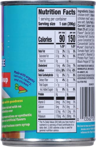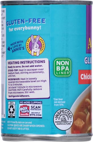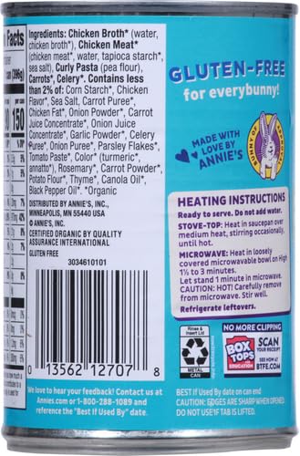 Annie’s Homegrown Gluten Free Chicken & Pasta Soup, 14 oz, is a comforting and wholesome soup made with organic chicken, carrots, and celery. It's gluten-free and contains no preservatives, artificial flavors, or synthetic colors. Each serving includes organic chicken and gluten-free pasta, making it a quick and easy meal for busy days. Simply heat in a microwavable bowl for 1.5 to 3 minutes and let cool for 1 minute before enjoying.