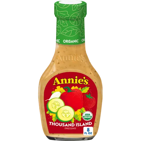 Brighten up salads and recipes with sweet and tangy Annie's Thousand Island Salad Dressing. Bursting with flavor, this certified USDA Organic and non-GMO salad dressing is creamy, tangy, and 90 calories per serving. We make our Thousand Island dressing with just the good stuff - no artificial flavors or synthetic colors, and using expeller pressed oil. Top your favorite mixed green salad, use as veggie dip, or add to a Reuben sandwich. This salad dressing is great to have on hand for a quick addition to a healthy lunch. Try all of Annie's salad dressings, made with quality ingredients. Annie's makes products in over 20 family-friendly categories, from fruit flavored snacks and cereal to mac and cheese. For busy bunnies and families on the go, we help make life a little easier and more delicious by spreading goodness through tasty foods and kindness to the planet.