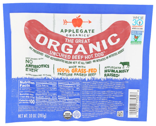 Applegate Organic Uncured Beef Hot Dogs, 10 oz, are a delicious and wholesome choice for hot dog lovers. Made from 100% organic grass-fed beef, these hot dogs are free from artificial ingredients, preservatives, and nitrates or nitrites. They offer a rich, natural flavor and a tender texture, perfect for grilling, boiling, or pan-searing. USDA Organic and gluten-free, they prioritize quality and health. Packaged in a 10 oz vacuum-sealed bag, they are ready to enhance your meals with a savory touch.
