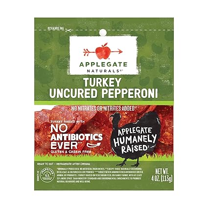 Applegate Uncured Turkey Pepperoni, 4 oz, delivers a flavorful, uncured turkey pepperoni that is made without any added nitrates or nitrites. This versatile and tasty product is perfect for adding a zesty kick to pizzas, sandwiches, or as a savory snack on its own. Crafted from high-quality turkey, it provides a healthier alternative to traditional pepperoni, while still offering that classic pepperoni taste you love. Enjoy the delicious, wholesome goodness with every bite.