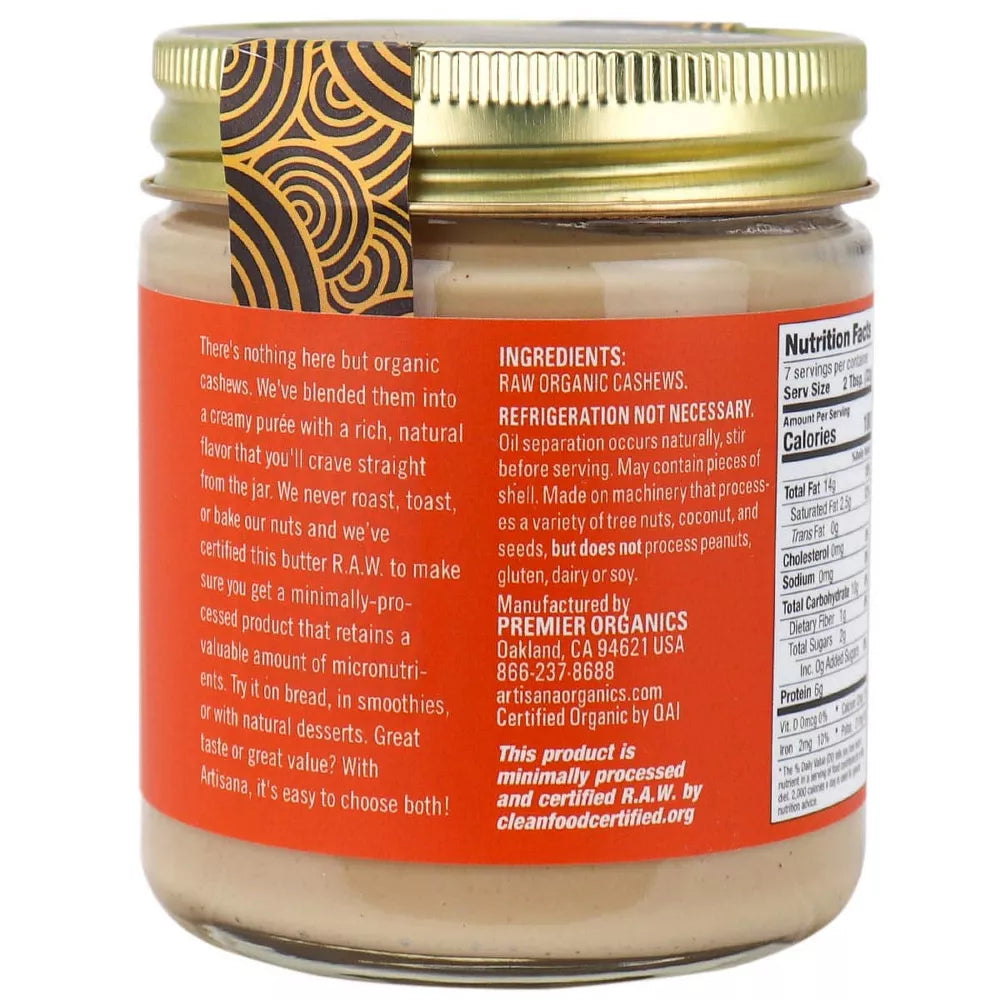 This creamy and smooth cashew butter is made from just one ingredient: organic raw cashews. It's gluten-free, Non-GMO Project Verified, and contains no added sugars, oils, or preservatives. Perfect for spreading on toast, adding to smoothies, or enjoying straight from the jar, it offers a rich, natural flavor and a good source of protein, vitamins, and minerals. Enjoy the pure taste of Artisana Organics Raw Cashew Nut Butter in every bite.