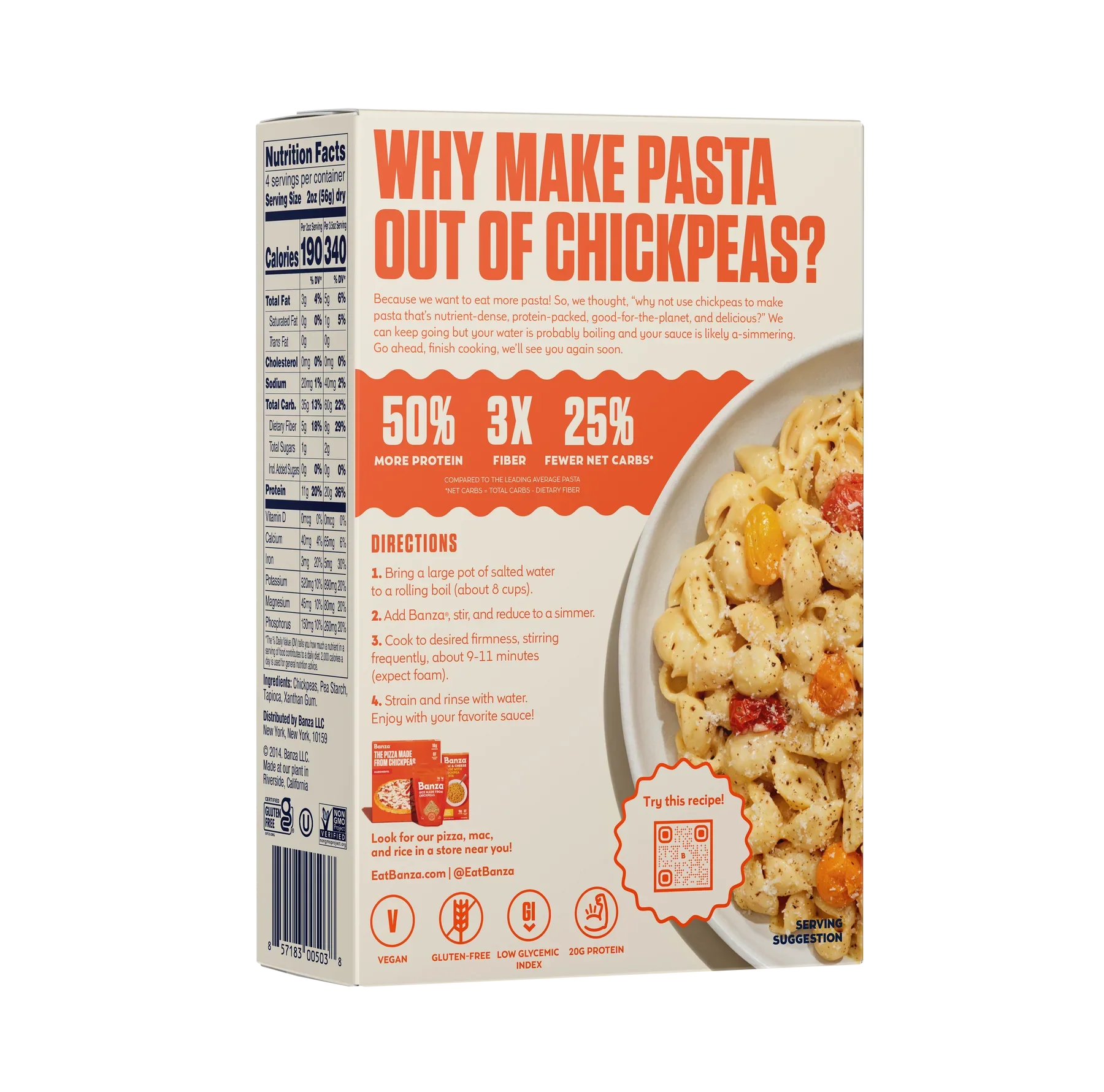Banza Shells, 3.5 oz are a nutritious and delicious pasta alternative made from chickpeas. Packed with 23 grams of protein and 8 grams of fiber per serving, they offer a healthier option compared to traditional pasta. These gluten-free and non-GMO shells are perfect for a variety of dishes, from creamy mac and cheese to hearty pasta salads. Enjoy the taste and benefits of chickpea-powered pasta in every bite.