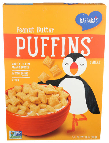 Barbara's Peanut Butter Puffins Cereal, 11 oz, is a delicious and nutritious breakfast option. Made with real peanut butter, this cereal is non-GMO, vegan, and kosher, making it suitable for various dietary preferences. Each serving contains 9 grams of sugar and provides a satisfying crunch that kids and adults alike will enjoy. Enjoy the rich peanut butter flavor of Barbara's Peanut Butter Puffins Cereal, perfect for starting your day with a tasty and wholesome breakfast.