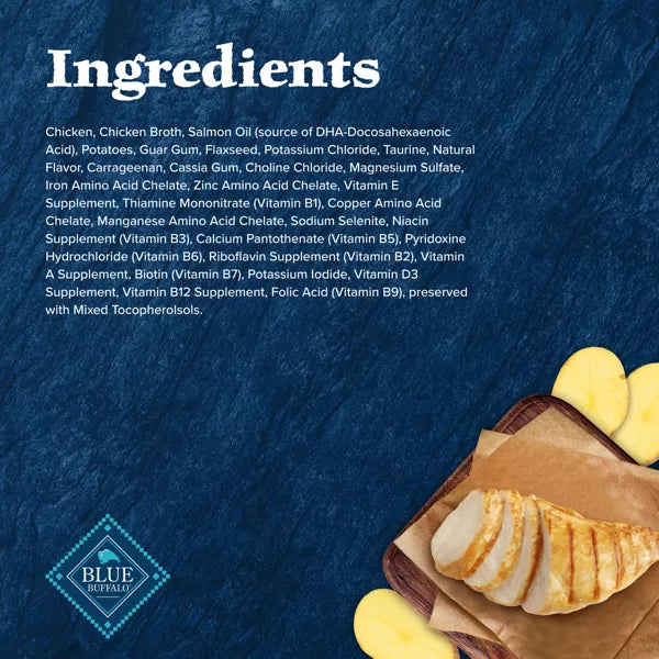 Blue Buffalo Wilderness Chicken Recipe Kitten Food is a high-protein, grain-free option designed to support the growth and development of kittens. This 3 oz can features real chicken as the primary ingredient, providing essential amino acids and nutrients for strong muscles and overall health. The recipe also includes wholesome ingredients like potatoes, flaxseed, and salmon oil, which are rich in omega-3 fatty acids and DHA to support cognitive development and a healthy coat. Free from chicken by-product meals, corn, wheat, soy, artificial flavors, and preservatives, this wet kitten food is formulated to meet the unique nutritional needs of growing kittens.