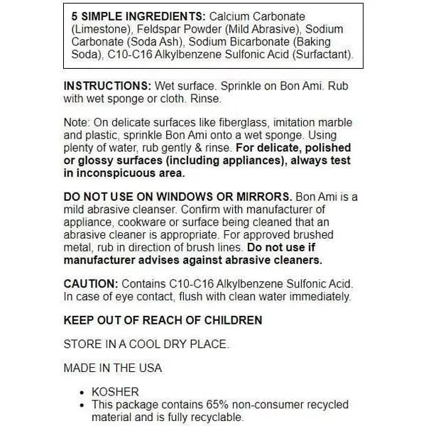 While some household cleaning products are harmful to you, your family or the environment, Bon Ami Scratch-Free Powder Cleanser is not. This cleanser is made from five simple ingredients, including limestone and baking soda. It cleans your home without dye, perfume, phosphorus or chlorine. Just sprinkle, scrub and rinse. It's perfect for cleaning pots and pans, the kitchen sink, bathroom tile and other hard surfaces. Try out this Bon Ami powder today!