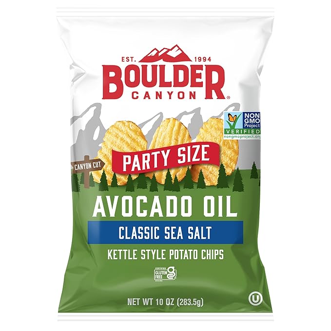 Boulder Canyon Classic Sea Salt Avocado Oil Kettle Chips are a delicious and crunchy snack option. This 10 oz bag features thickly sliced, kettle-cooked potato chips made with premium American-grown potatoes and cooked in pure avocado oil. The chips are seasoned with sea salt, providing a subtle, buttery flavor and a satisfying crunch. They are gluten-free, Non-GMO Project Verified, and contain no artificial ingredients or preservatives. Enjoy these chips on their own or paired with your favorite dip for a tasty and wholesome snack.