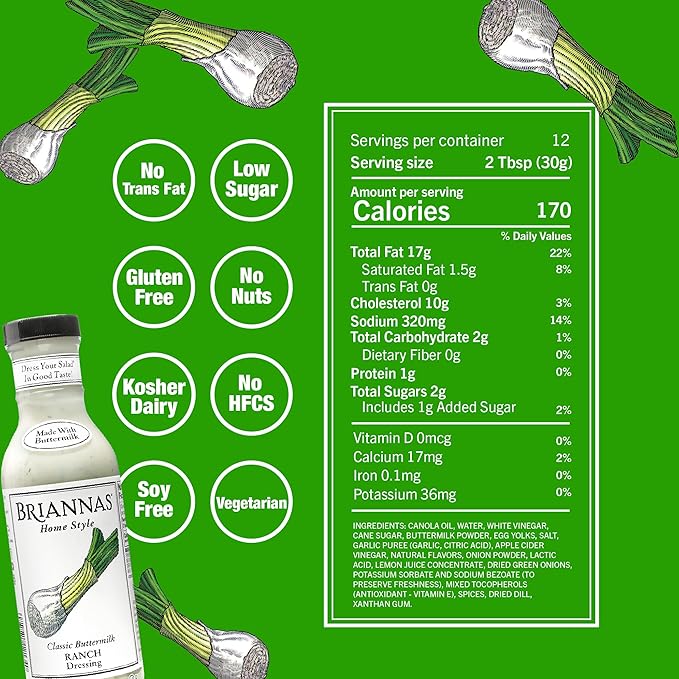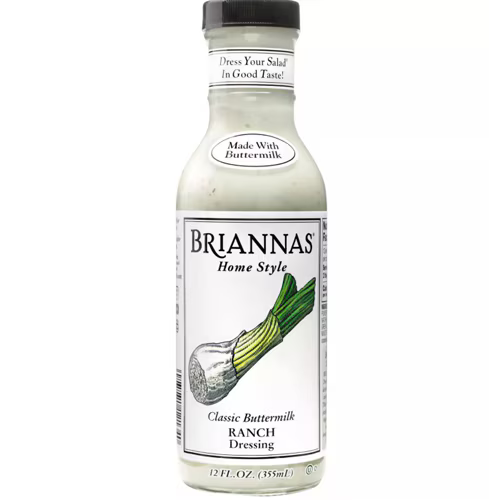 Enjoy the creamy and tangy taste of Brianna's Buttermilk Ranch Classic Dressing. This 12 oz bottle features a rich and smooth dressing made with buttermilk, garlic, and herbs. Perfect for salads, dipping vegetables, or as a topping for sandwiches, it adds a classic ranch flavor to your meals. Made with simple and wholesome ingredients, it's a delicious addition to your pantry.