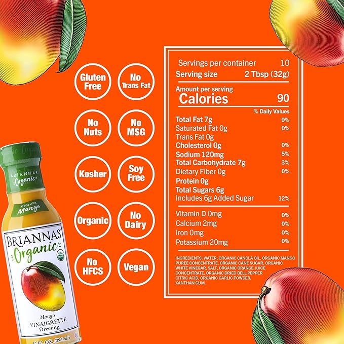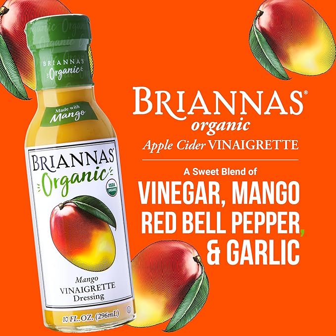 Brianna's Organic Tropical Mango Vinaigrette Dressing, 10 oz, is a delicious and vibrant salad dressing made with certified organic ingredients. This tangy and sweet dressing features the unique flavor of tropical mango, adding a refreshing taste to your green salads. It's also perfect as a dip for fruits and vegetables, taking your garden tomatoes to a whole new level! Enjoy the tropical goodness of Brianna's Organic Mango Vinaigrette Dressing on your favorite dishes.