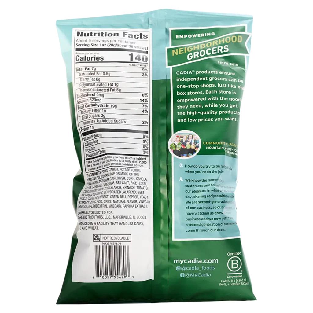 Cadia Everyday Jalapeno Veggie Straws, 5 oz, are a flavorful and crunchy snack option. Made from real vegetables like potatoes, spinach, and tomatoes, these veggie straws are seasoned with bold jalapeño flavor, providing a perfect blend of spicy and savory. They are Non-GMO, Kosher, and Vegan, making them a healthy choice for any snacking occasion. Enjoy the satisfying crunch and the explosion of heat with every bite of Cadia Everyday Jalapeno Veggie Straws.