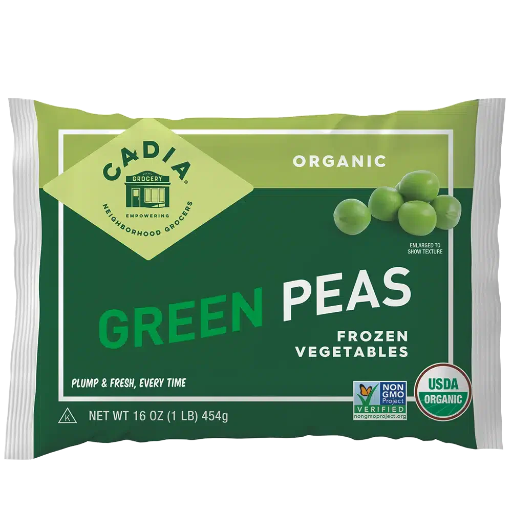Cadia Everyday Organic Frozen Peas, 16 oz, are a convenient and nutritious addition to your meals. Harvested at the peak of ripeness, these organic peas are quickly frozen to lock in their fresh flavor and tender texture. Perfect for soups, stews, salads, or as a simple side dish, they offer a delightful sweetness and vibrant green color. USDA Organic and Non-GMO, Cadia Everyday Organic Frozen Peas are a wholesome and versatile choice for those who value quality and natural ingredients in their diet.
