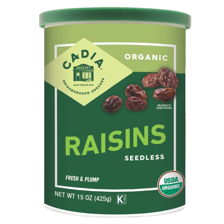 Cadia Organic Raisins are a delicious and nutritious snack option. This 15 oz package features plump, juicy raisins made from organic Thompson seedless grapes grown in the sunny San Joaquin Valley. The raisins are naturally sweet with no added sugar, and they have a chewy texture that adds an enjoyable element to each bite. They are Non-GMO, gluten-free, and free from artificial preservatives, ensuring a wholesome and natural ingredient for your meals. Enjoy the rich, amber-colored raisins in your favorite recipes or as a satisfying snack.