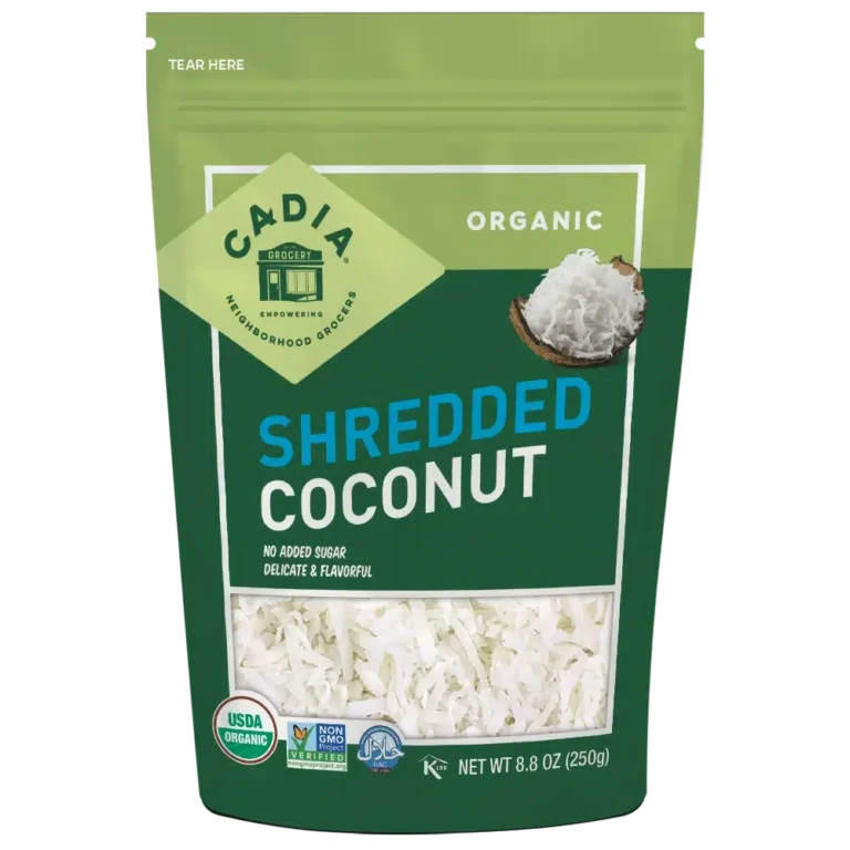 Cadia Organic Shredded Coconut, 8.8 oz, is a high-quality organic product made from fresh shredded coconut meat. It is dried until it becomes light, delicate, and tender, offering a sunny, tropical flavor. This shredded coconut adds natural sweetness to a variety of dishes, including granola, energy bars, salads, smoothies, yogurt, and even breading for coconut shrimp. Free from artificial additives and preservatives, it provides a wholesome and natural taste, making it a versatile ingredient for both sweet and savory recipes.