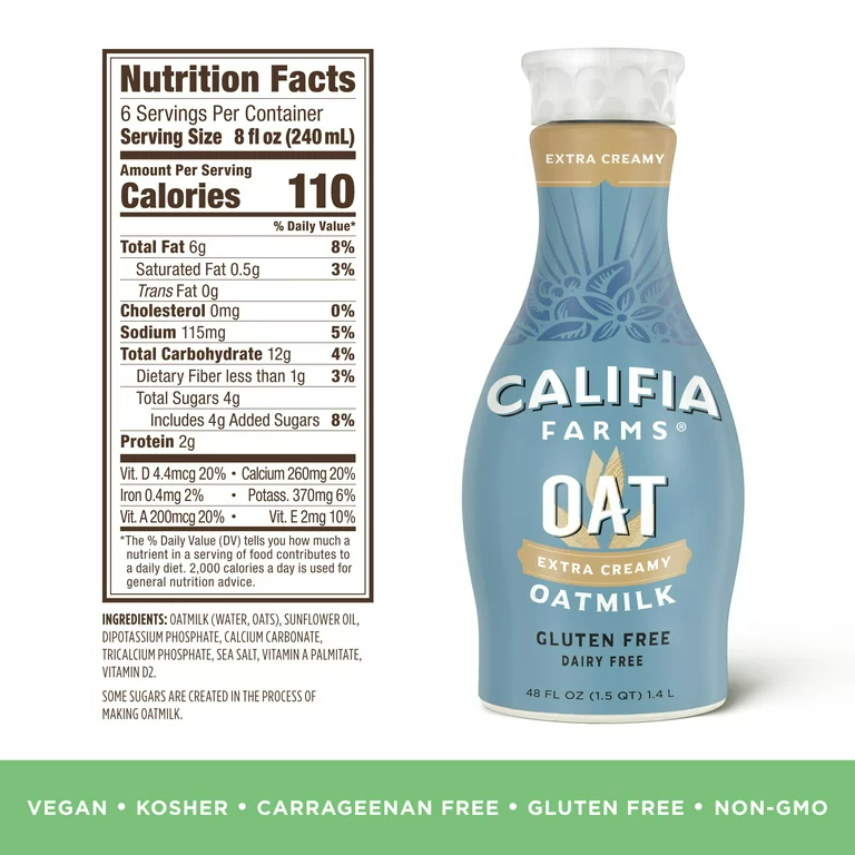 SIMPLE PLANT-BASED INGREDIENTS: Califia Farms oat milks are made with plant-based, dairy-free ingredients that are Non-GMO Certified, Glyphosate free, Kosher, vegan, and free from carrageenan. Made with gluten-free oats.