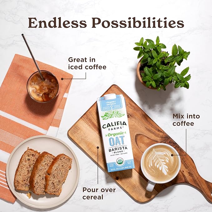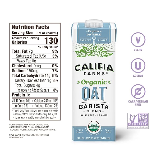 Califia Farms Organic Oat Barista Blend Oat Milk is a versatile and delicious plant-based milk option, perfect for creating creamy lattes and other coffee beverages. This 32 oz carton features organic, gluten-free oats, providing a naturally creamy and subtly sweet flavor. It is Non-GMO Certified, Kosher, vegan, and free from carrageenan, making it a great choice for those with dietary restrictions. The oat milk blends smoothly into both hot and iced coffee, ensuring a rich and satisfying cup every time. Enjoy the convenience and quality of Califia Farms Organic Oat Barista Blend Oat Milk in your favorite drinks.