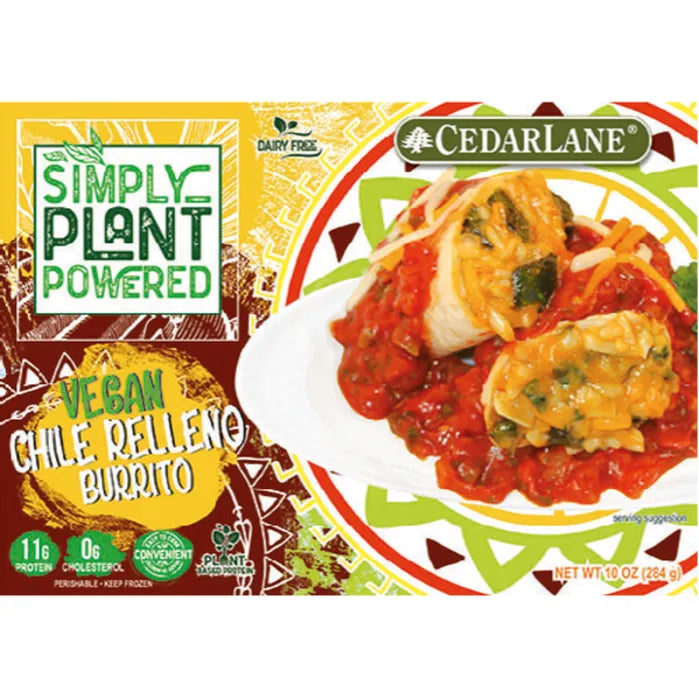 Cedarlane Plant Based Chile Relleno Burrito, 10 oz, is a delicious and convenient meal option for those seeking a plant-based alternative. This burrito features a flavorful blend of roasted green chiles, black beans, and brown rice, all wrapped in a soft tortilla. The combination of spices and ingredients creates a satisfying and hearty meal that is both nutritious and tasty. Perfect for a quick lunch or dinner, this burrito is easy to prepare and enjoy, making it an excellent choice for busy individuals looking for a healthy and delicious plant-based option.