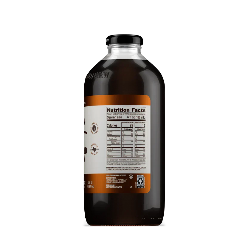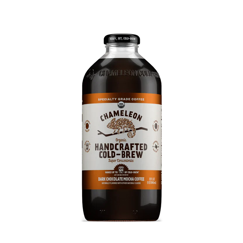 Chameleon Dark Chocolate Mocha Cold Brew Concentrate, 32 oz, is a rich and bold coffee concentrate made from organic, sustainably sourced coffee beans. It features a smooth and indulgent dark chocolate mocha flavor, providing a deliciously caffeinated boost. This concentrate is perfect for mixing with milk or water to create a refreshing cold brew beverage. It's also dairy-free, gluten-free, and contains no artificial flavors or preservatives.