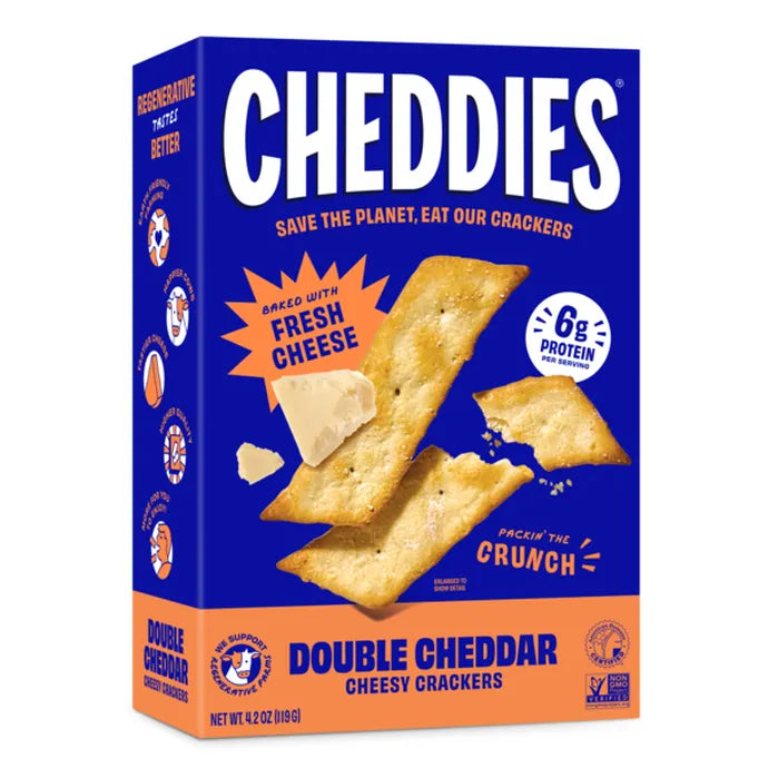 Cheddies Double Cheddar Cheesy Crackers are a crunchy snack made with aged and traditional cheddar cheese for a rich, savory flavor. Each 4.2 oz box contains about four servings, with 6 grams of protein per serving. Crafted from simple ingredients like wheat flour, organic cheddar cheese, and natural seasonings, these crackers are free from artificial flavors and dyes. They’re designed to be a wholesome, on-the-go option for cheese lovers looking for a satisfying and better-for-you snack.