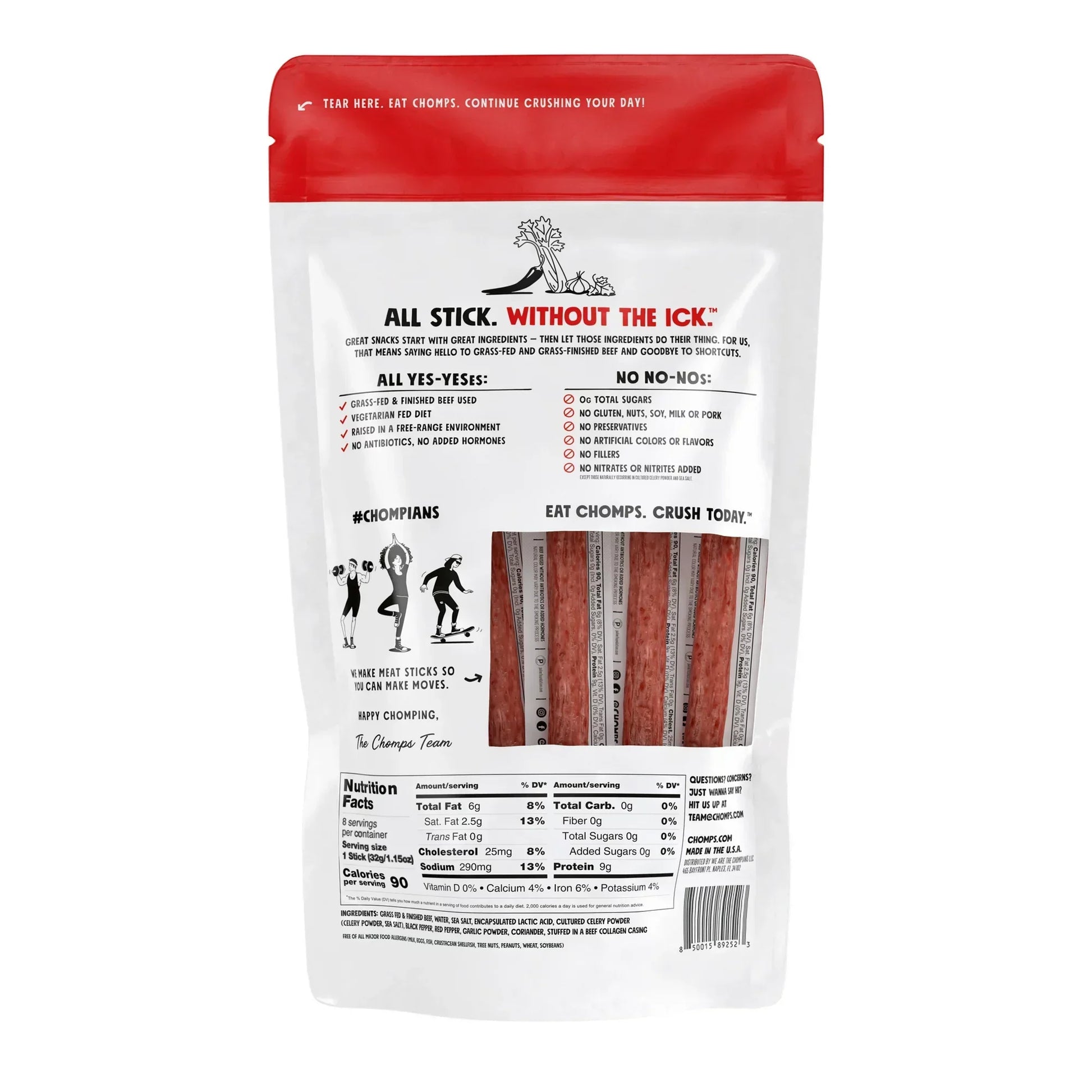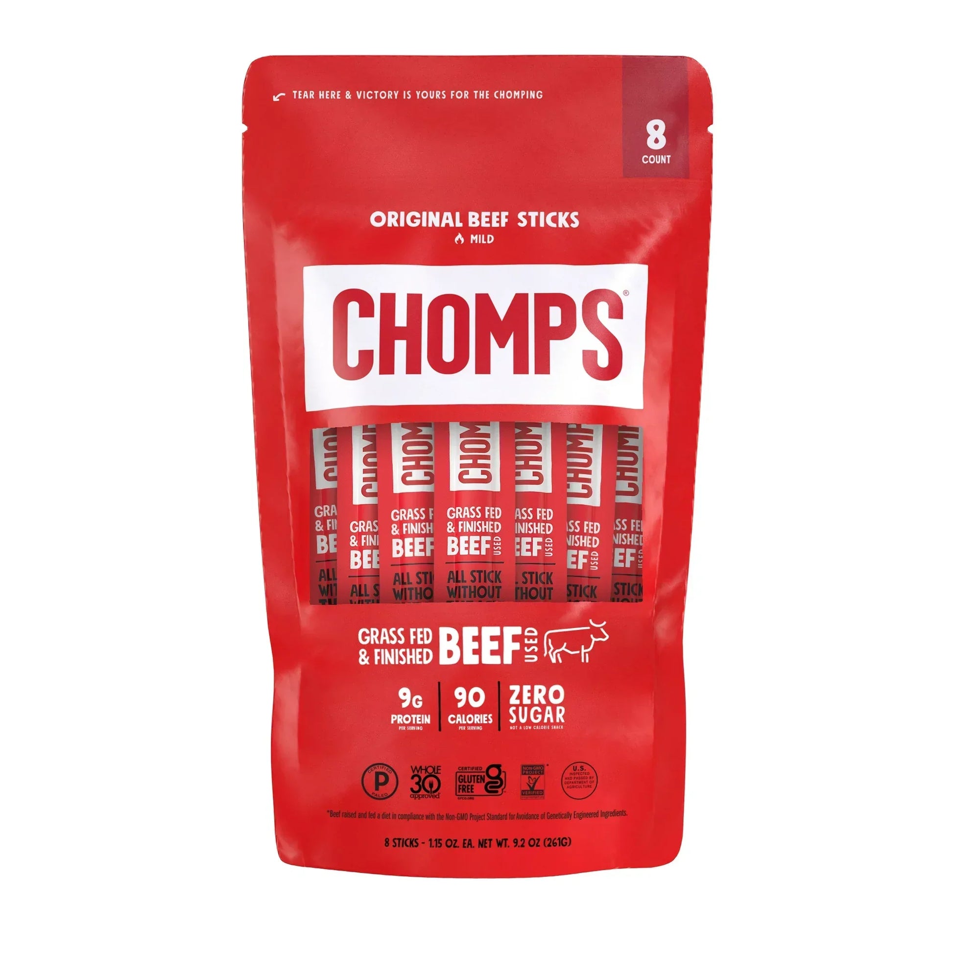 Chomps Original Beef Jerky Sticks, 8 Count, are a delicious and convenient snack made from 100% grass-fed and grass-finished beef. Each stick is packed with 10 grams of protein, zero sugar, and just 100 calories. These jerky sticks are keto-friendly, Whole30 approved, Paleo, certified gluten-free, and free from the top 9 allergens. They offer a savory, slightly smoky, and slightly spicy flavor that's perfect for on-the-go snacking. Enjoy the high-quality taste and nutritional benefits of Chomps Original Beef Jerky Sticks anytime!