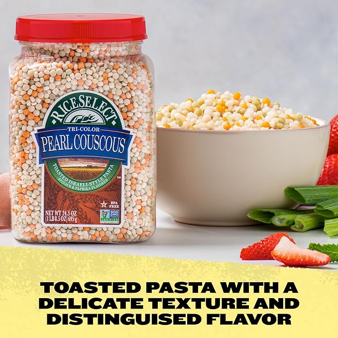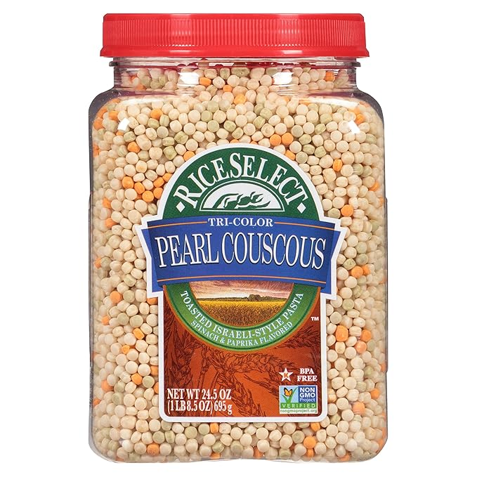 Osem Couscous Pearl Tricolor, 21.16 oz, offers a vibrant and nutritious base for your favorite dishes. This tri-color pearl couscous is made from wheat flour, spinach powder, and paprika extract, providing a subtle, nutty flavor and rich texture. It is 100% natural, cholesterol-free, sodium-free, and saturated fat-free, making it a healthy choice for your meals. Enjoy it as a side dish, in salads, or as a main course with your favorite proteins and vegetables.