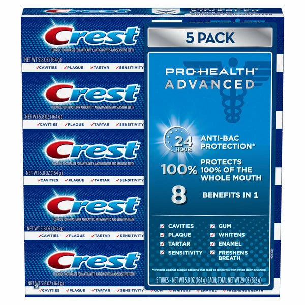 Crest Pro Health Advanced Toothpaste in the 5.9 oz, 5-count pack offers up to 24 hours of antibacterial protection and whole mouth defense when used twice daily. This fluoride toothpaste is designed to combat cavities, gingivitis, and sensitivity while delivering 10 benefits in one formula to protect 100% of your mouth, including teeth, gums, and breath.