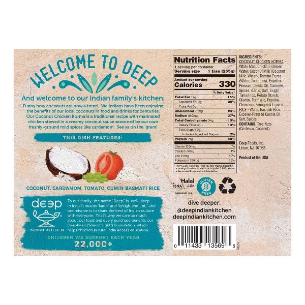 Deep Indian Kitchen Coconut Chicken Korma, 9 oz, is a delicious and convenient frozen meal made with juicy pieces of chicken marinated in a rich, creamy coconut sauce. This flavorful dish is crafted with freshly ground spices and veggies, offering a taste of authentic Indian cuisine. It's perfect for a quick and easy meal that's ready in minutes with just a microwave. Enjoy the restaurant-quality flavors of Coconut Chicken Korma from the comfort of your home!