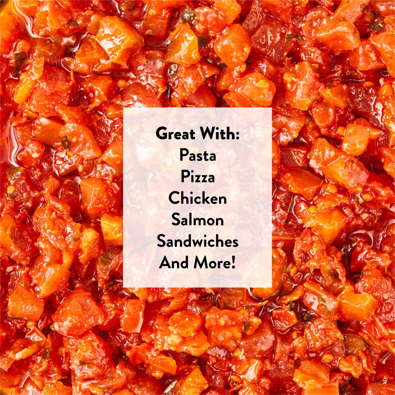 Delallo Imported Italian Tomato Bruschetta, 9.88 oz, is a classic Italian antipasto made with red-ripe Italian tomatoes, extra virgin olive oil, garlic, and fresh basil. This vibrant and flavorful topping is perfect for serving with toasted bread, enhancing pasta dishes, or adding a gourmet touch to marinades and dressings. It is gluten-free, non-GMO, and vegan, making it a versatile and wholesome choice for any occasion.