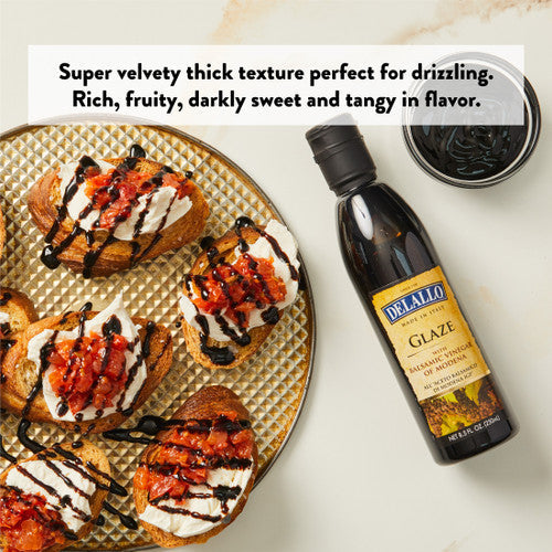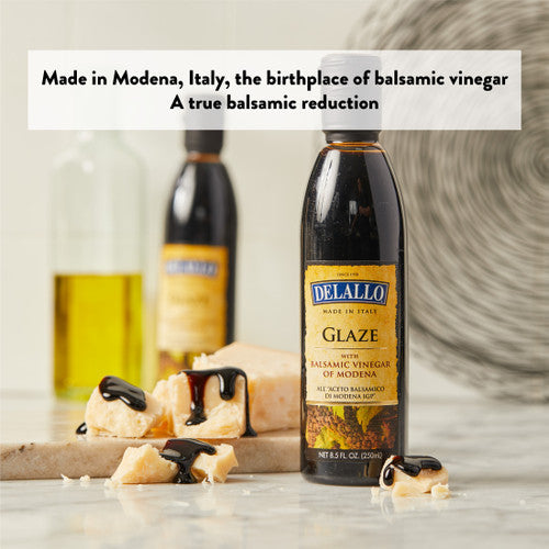 An 8.5-ounce bottle of DeLallo Modenacrem Balsamic Glaze, featuring a rich and velvety reduction of authentic balsamic vinegar. This glaze offers a smooth texture with a balanced sweet and tangy flavor, making it perfect for drizzling over salads, grilled meats, vegetables, and even desserts. A versatile kitchen staple, it enhances dishes with a touch of gourmet flair, providing depth and complexity to everyday meals.