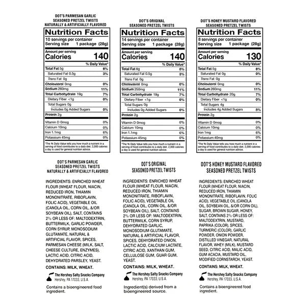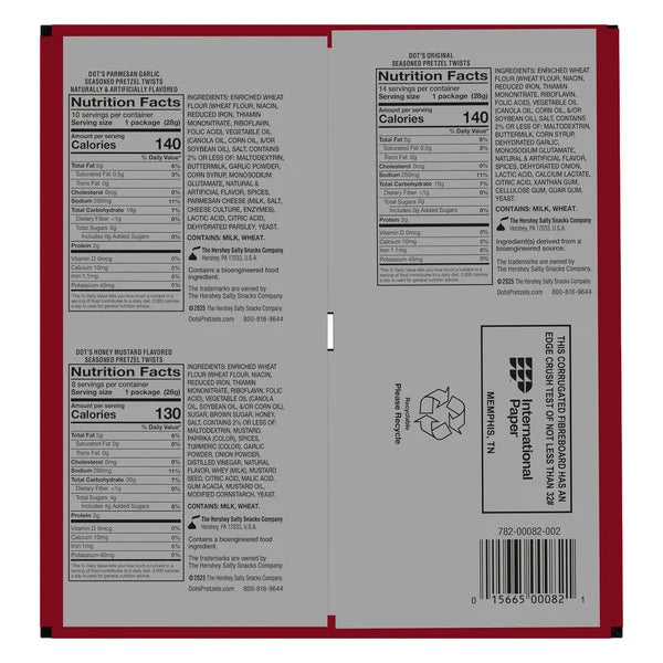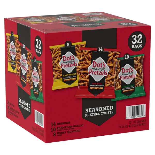 Dot’s Homestyle Seasoned Pretzel Twists Variety Pack includes 32 individually wrapped 1 oz bags featuring three bold flavors: Original, Parmesan Garlic, and Honey Mustard. Each pretzel twist is baked with Dot’s signature seasoning blends, delivering a rich, savory taste and satisfying crunch. The small-town recipe has become a snacking favorite, and the convenient single-serve bags are perfect for lunchboxes, road trips, or sharing with friends.