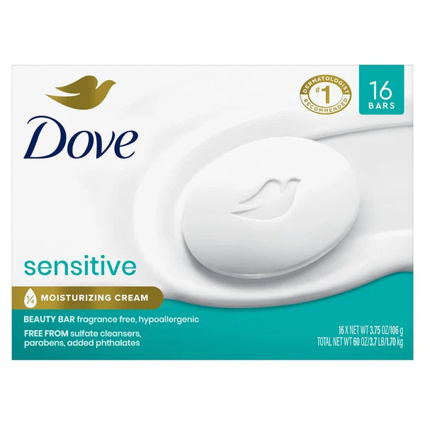 Dove Moisturizing Beauty Bar Soap Sensitive, 3.75 oz, 16 count, is formulated for gentle cleansing and hydration, especially for sensitive skin. Each bar contains one-quarter moisturizing cream and is both unscented and hypoallergenic, making it suitable for use on the face, hands, and body. Dermatologist recommended, this soap helps maintain the skin’s natural moisture barrier while effectively washing away bacteria without causing dryness or irritation. Ideal for daily use, it offers a mild and nourishing alternative to traditional bar soaps.