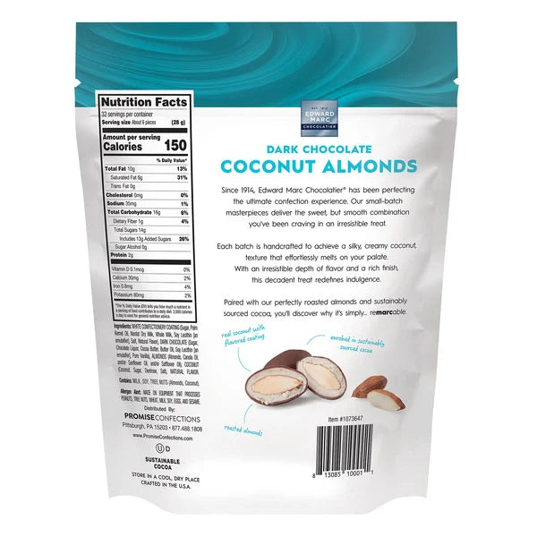 Treat yourself to a decadent blend of textures and flavors with Edward Marc Coconut Almonds. Each bite features oven-roasted almonds lightly salted and rolled in sweet coconut, then enrobed in premium dark chocolate for a luxurious finish. Crafted with care and sustainably sourced cocoa, this snack is a perfect balance of crunchy, creamy, salty, and sweet.