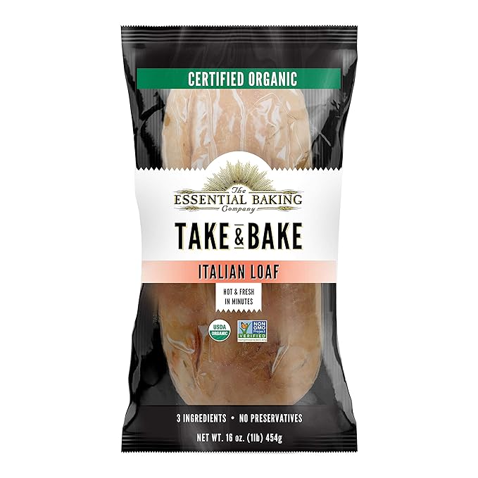 Essential Baking Company Organic 'Take & Bake' Italian Loaf is a delicious and convenient option for your meals. This 16 oz loaf features a traditional Italian bread with a porous, chewy crumb and a soft crust, dusted with flour. Made with only five simple ingredients, including organic unbleached wheat flour, water, sea salt, and a natural starter, this bread is USDA Certified Organic and Non-GMO. It's perfect for enjoying fresh and hot in minutes, without any preservatives or artificial additives. Enjoy the authentic taste and quality of Essential Baking Company Organic 'Take & Bake' Italian Loaf in your favorite dishes!