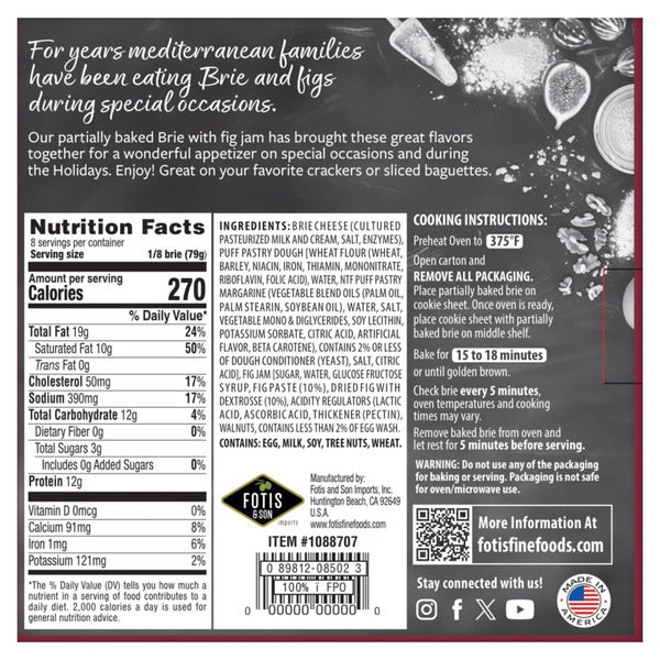 Fotis Baked Brie with Fig Jam and Chopped Walnuts is a rich and savory appetizer featuring creamy brie cheese topped with sweet fig jam and crunchy walnuts weighing in at 22 ounces and ready to heat and serve for effortless entertaining or indulgent snacking