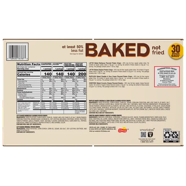 Frito-Lay Baked Potato Crisps and Crunchy Cheese Snacks Variety Pack includes 30 single-serve bags featuring a mix of baked favorites. The assortment contains Lay’s Baked Barbecue Potato Crisps, Lay’s Baked Original Potato Crisps, Ruffles Baked Cheddar & Sour Cream Potato Crisps, and Cheetos Baked Crunchy Cheese Snacks. Each snack is baked, not fried, offering at least 50% less fat than regular chips, and is gluten-free for a lighter, satisfying crunch. Perfect for lunchboxes, parties, or on-the-go snacking.