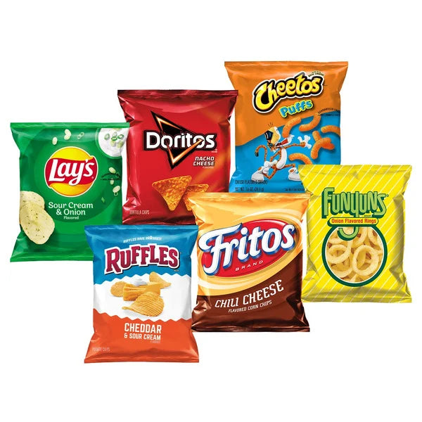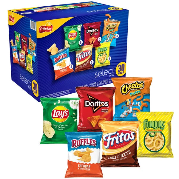 Frito-Lay Select Mix Variety Pack includes 30 single-serve bags of some of the brand’s most popular snacks. The assortment features a flavorful mix of chips and crunchy treats, including Lay's Sour Cream & Onion, Doritos Spicy Nacho, Cheetos Puffs, Ruffles Cheddar & Sour Cream, Fritos Chili Cheese, and Funyuns Onion Flavored Rings. Each bag is individually portioned, making it a convenient option for lunches, parties, or on-the-go snacking. With a wide range of textures and bold flavors, this pack offers something for everyone to enjoy.