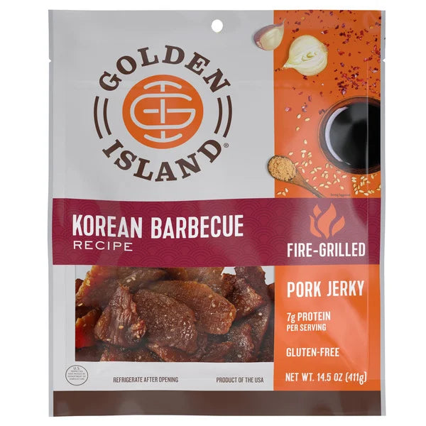 Golden Island Pork Jerky Pieces in Korean Barbecue flavor, 14.5 oz, are fire-grilled and marinated to deliver a sweet and savory taste inspired by traditional Korean recipes. Made from 100% all-natural pork, they’re gluten-free and contain no artificial ingredients, nitrates, or preservatives. Each serving provides 7 grams of protein, making them a satisfying snack that’s tender, flavorful, and ready to eat straight from the bag.