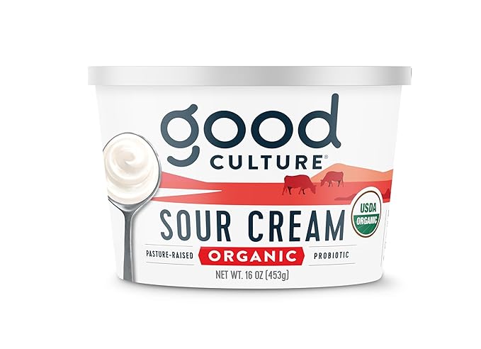 Good Culture Organic Pasture Raised Sour Cream Tub, 16 oz, is a rich and creamy option for your culinary needs. Made with milk from pasture-raised cows, this sour cream contains simple ingredients, including organic cultured cream, enzymes, and live and active cultures (L. acidophilus and B. lactis). It is free from preservatives, added hormones, and artificial ingredients, ensuring a wholesome and natural product. Enjoy the delicious taste and probiotic benefits of Good Culture Organic Pasture Raised Sour Cream, perfect for adding a tangy touch to your favorite dishes.