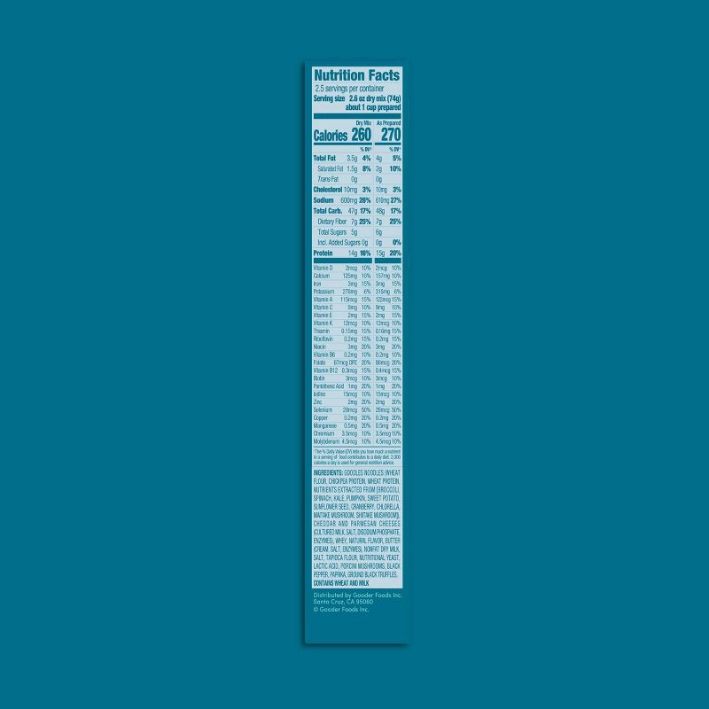Indulge in the rich and savory taste of Goodles Here Comes Truffle Mac & Cheese. This 6 oz box features a creamy blend of white cheddar and parmesan, perfectly balanced with the earthy, unmistakable flavor of real black truffles. Packed with 14g of protein and 7g of fiber per serving, it's a nutritious and delicious option for mac and cheese lovers. Made with real cheese and no GMOs, artificial colors, or preservatives, it's a guilt-free treat that's sure to satisfy your cravings. Enjoy the luxurious taste of truffle in every bite.
