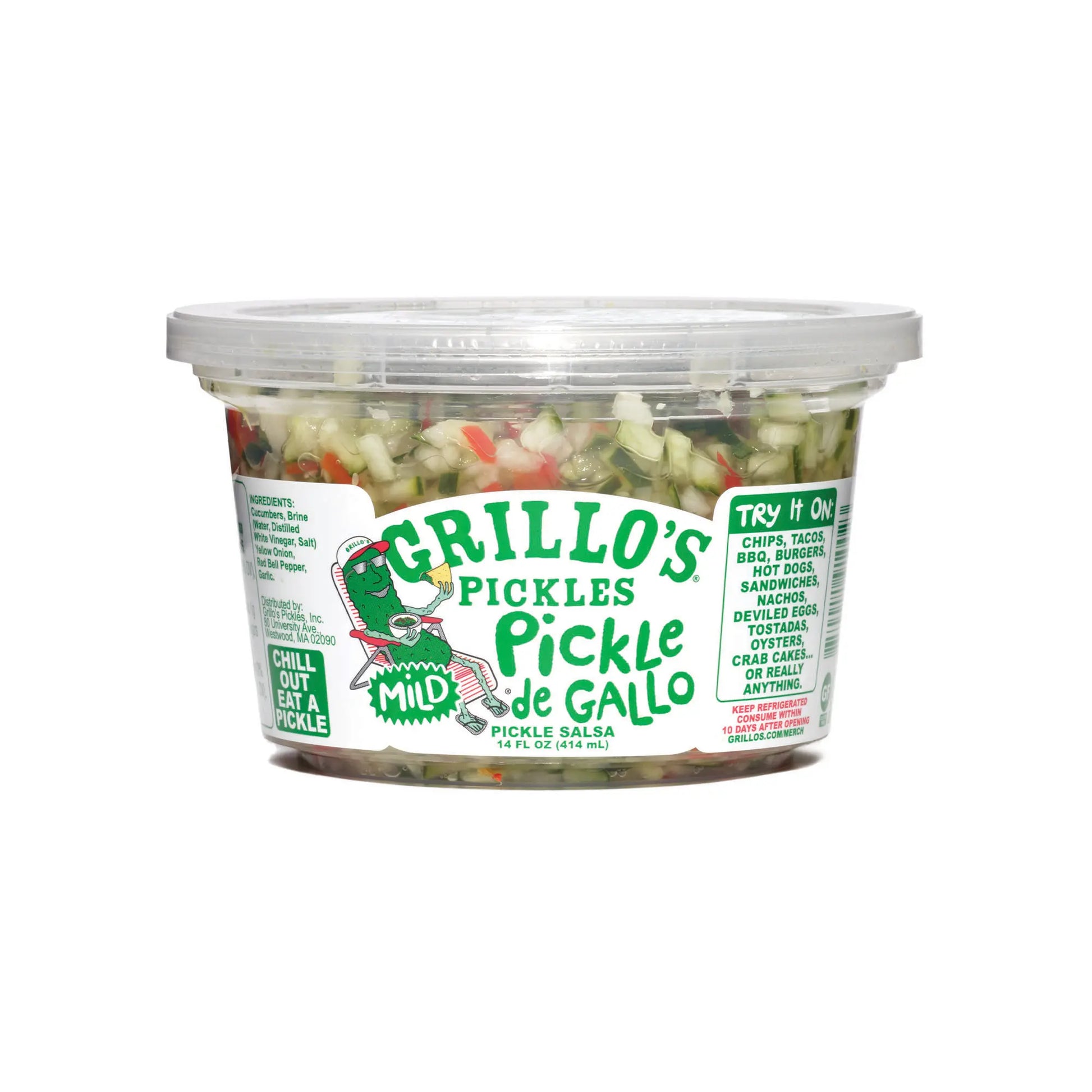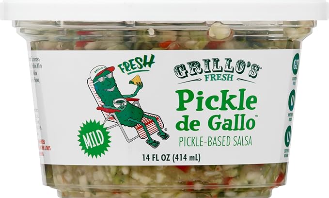 Grillo's Pickles Mild Pickle de Gallo Pickle Salsa, 14 oz, is a fresh and zesty pickle-based salsa. Made with crisp cucumbers, tangy brine, and a blend of onions and bell peppers, it offers a crunchy twist on traditional salsa. Perfect for dipping, spreading, or topping your favorite snacks, this salsa adds a burst of flavor to any meal. Enjoy it chilled for a refreshing treat!