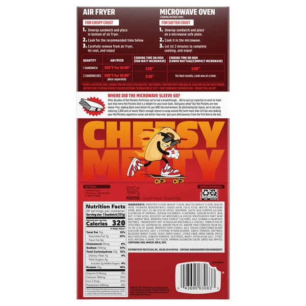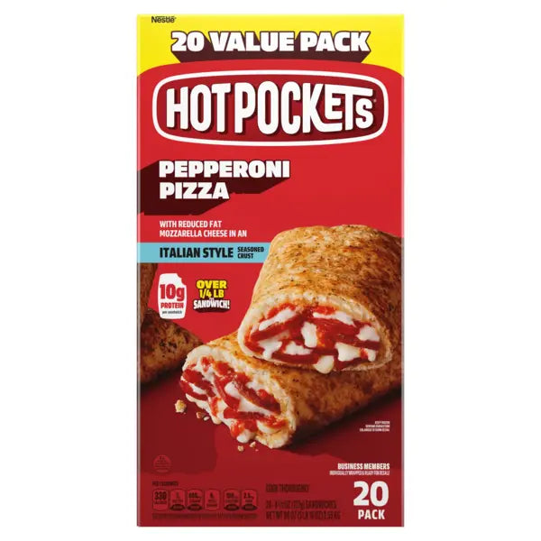 Looking for a quick, satisfying snack that delivers classic pizza flavor in minutes? The Hot Pockets Premium Pepperoni Pizza, 4.5 oz, 20 ct pack might be just what you need. Packed with premium pepperoni made from pork, chicken, and beef, plus reduced-fat mozzarella cheese, all wrapped in a crispy Italian-style seasoned crust. Each sandwich is individually wrapped and comes with a crisping sleeve for easy microwave prep—ready in just 2 minutes.
