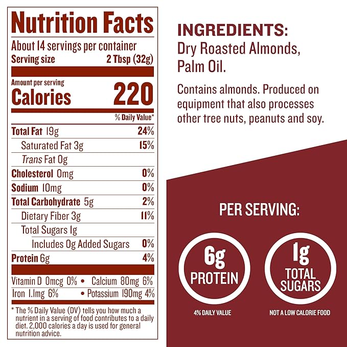 This almond butter is made with just two simple ingredients: dry roasted almonds and palm oil. It's gluten-free, Non-GMO Project Verified, and keto-friendly. The unique grinding process ensures a creamy texture without the need for stirring. Perfect for spreading on toast, adding to smoothies, or enjoying straight off the spoon, it's a delicious and nutritious option for almond butter lovers.