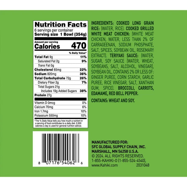 Looking for a quick and tasty meal? The Kahiki Chicken Rice Bowl with Teriyaki Sauce comes in a pack of six 12.5 oz bowls. Each bowl features grilled white meat chicken, long grain rice, and a mix of vegetables like broccoli, carrots, edamame, and red bell peppers, all topped with a savory teriyaki sauce. It’s ready to eat in minutes and made with chicken raised without antibiotics.