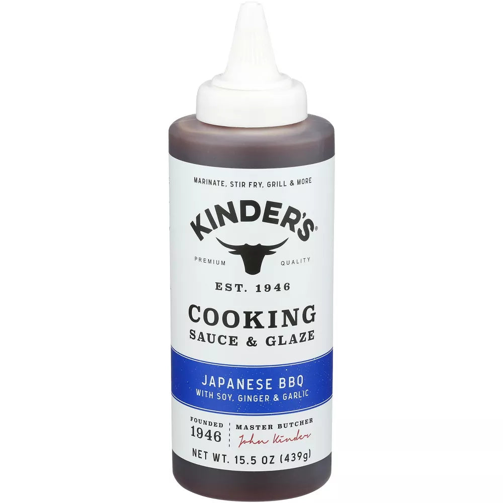 Kinder's Cooking Sauce Japanese BBQ, 15.5 oz - This savory sauce is a blend of soy sauce, ginger, and garlic, offering a perfect balance of sweet and savory flavors. It's great for marinating, stir-frying, grilling, and glazing. The sauce is gluten-free, contains no high fructose corn syrup, and has no artificial flavors. Enjoy the rich, authentic taste of Kinder's Japanese BBQ Cooking Sauce in your dishes.