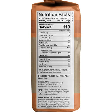 King Arthur Flour White Whole Wheat Flour is a versatile and nutritious baking essential. Made from 100% whole grains, this flour offers all the benefits of whole wheat with a milder taste and lighter color. It's finely milled from hard white wheat, making it perfect for a variety of recipes, from bread and muffins to cookies and pancakes. With a 5-pound bag, you’ll have plenty of flour to fuel your baking adventures, ensuring your creations are wholesome and delicious. This flour is non-GMO and contains no preservatives, so you can feel good about the ingredients you’re using in your kitchen.