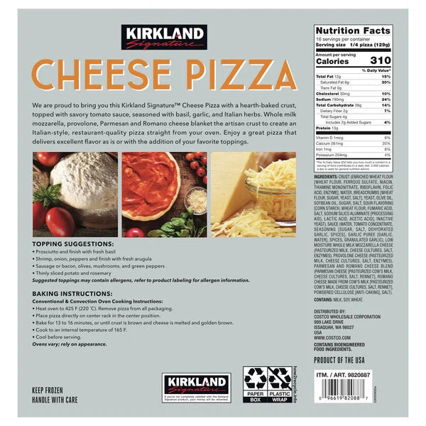 The Kirkland Signature Cheese Pizza Thin Crust comes in a pack of four, each weighing 18.25 ounces. These pizzas feature a savory tomato sauce seasoned with basil, garlic, onion, and herbs. They are topped with a blend of whole milk mozzarella, provolone, Parmesan, and Romano cheese. The hearth-baked crust is made with extra virgin olive oil and has a sourdough flavor, providing a delicious and crispy base for the toppings. Perfect for a quick and easy meal, these pizzas can be baked in the oven for a convenient and tasty option.
